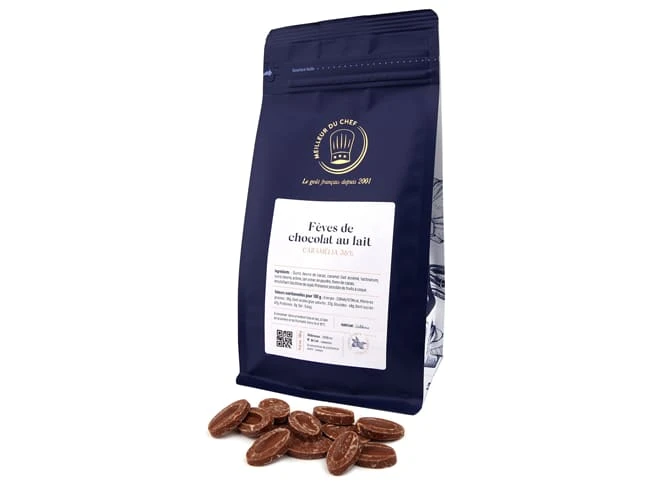 - Ingrédients : sucre, beurre de cacao, caramel (lait écrémé, lactoserum, sucre, beurre, arôme, lait entier en poudre, fèves de cacao, émulsifiant (lécithine de soja). Présence possible de fruits à coque.