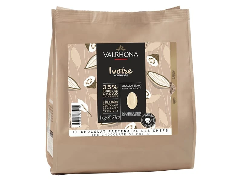 Onctueux et vanillé, le chocolat blanc Ivoire, créé par Valrhona, est peu sucré et dévoile des arômes de lait chaud rehaussé de légères notes de vanille.