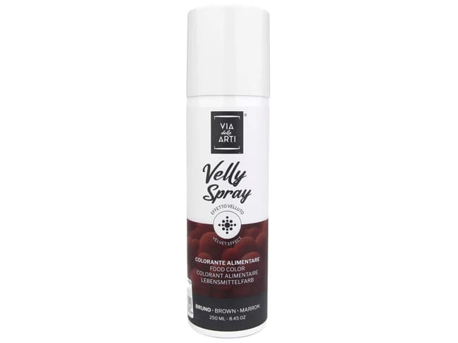 Spray à base de beurre de cacao coloré. Donne un effet velours à vos entremets, bûches, petits gâteaux.