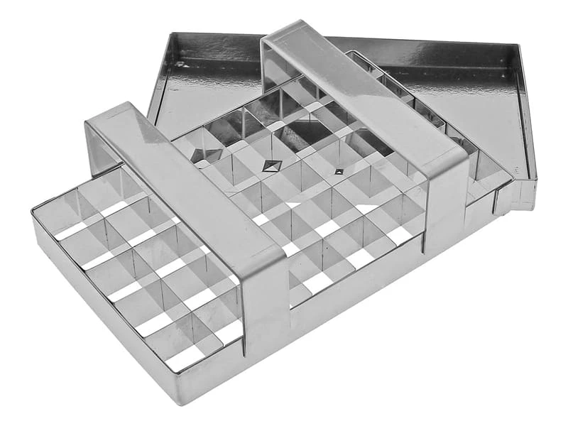Pour couper en une seule fois 40 carrés de 2,5 cm, avec plateau support, en fer blanc.