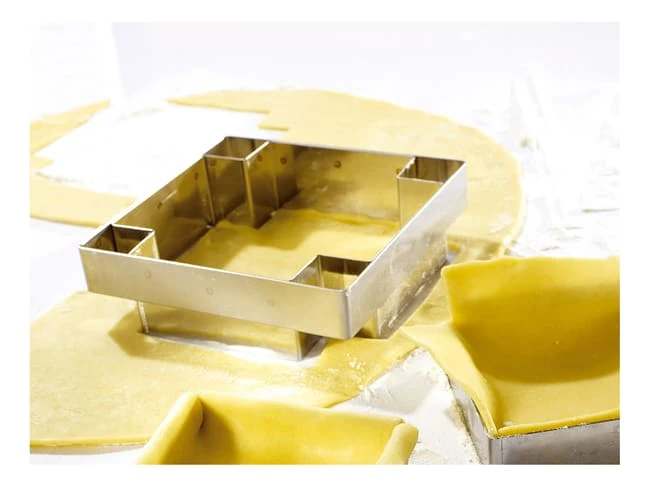 Ces carrés et leur découpoir adaptés permettent de réaliser facilement des fonds de tartelettes et tarte carrées aux contours nets, sans surplus de pâte dans les angles.