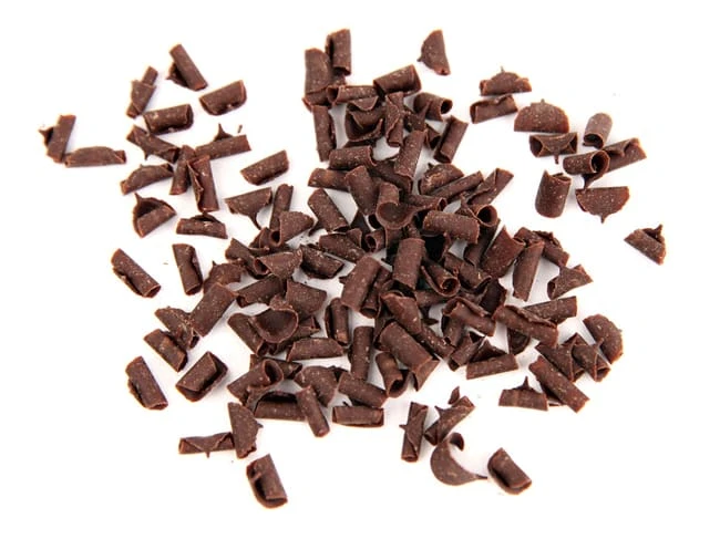 Boîte de mini-copeaux de chocolat noir 48% cacao min, pour la décoration des desserts et entremets à base de chocolat.