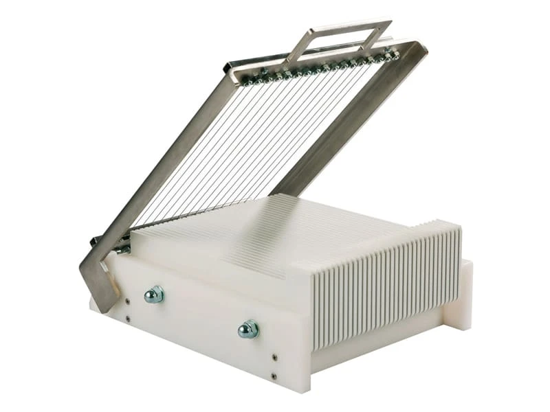 Permet la découpe de bandes, carrés ou rectangles de ganâche, pâte de fruits, entremets, etc…