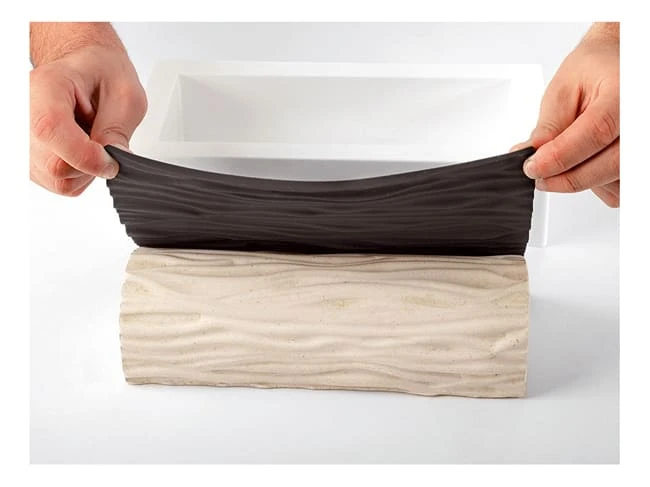Kit pour préparer des bûches originales qui se compose d’un tapis en silicone texture arabesque et du moule à bûche en silicone.