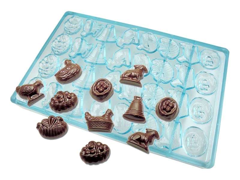 Moule en tritan comportant 32 empreintes de sujets (nid, oeuf, cloche, poule, lapin…) pour les festivités de Pâques.
