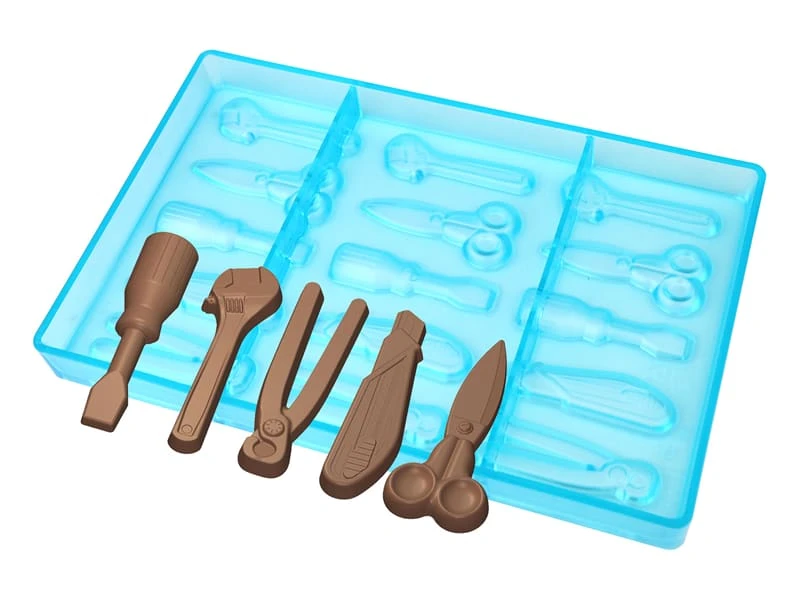 Moule en tritan composé de 15 empreintes formant 5 outils : clef à molette, ciseaux, tournevis, cutter, pince.