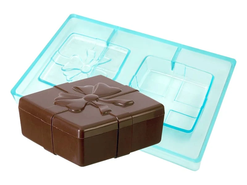 Moule en tritan comportant 2 empreintes (recto/verso) pour réaliser une boîte carrée avec ruban en chocolat.