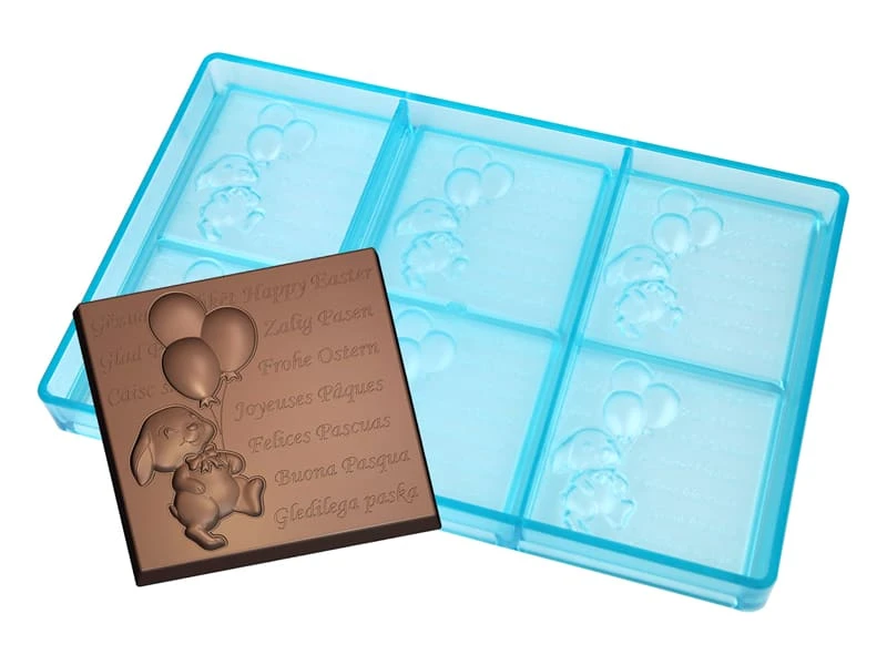 Moule en tritan comportant 6 tablettes, décor Joyeuses Pâques, illustrées par un petit lapin tenant 3 ballons.