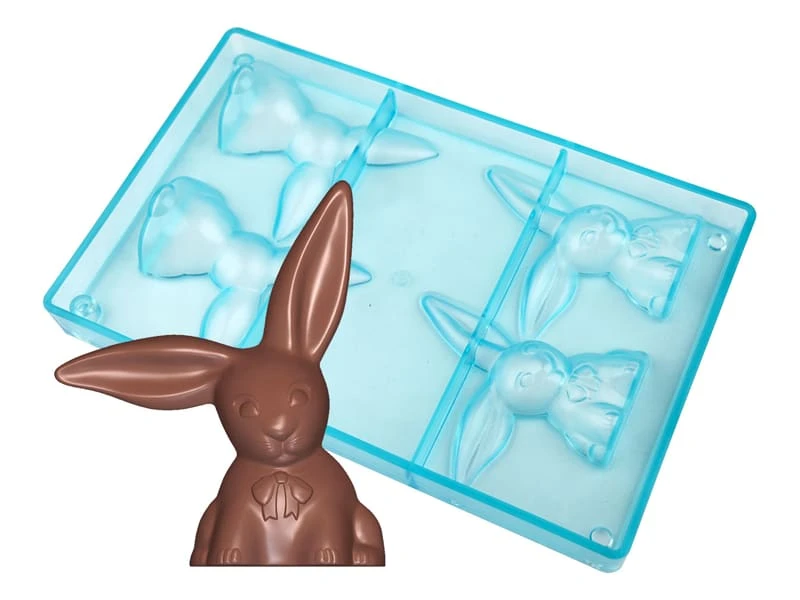 Moule en tritan comportant 4 empreintes (recto/verso) permettant de former après assemblage 2 lapins aux grandes oreilles.
