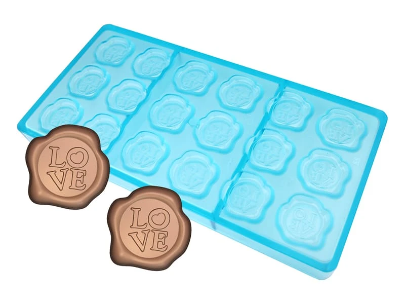 Moule en tritan composé de 18 empreintes formant des pastilles avec l’inscription « Love ».