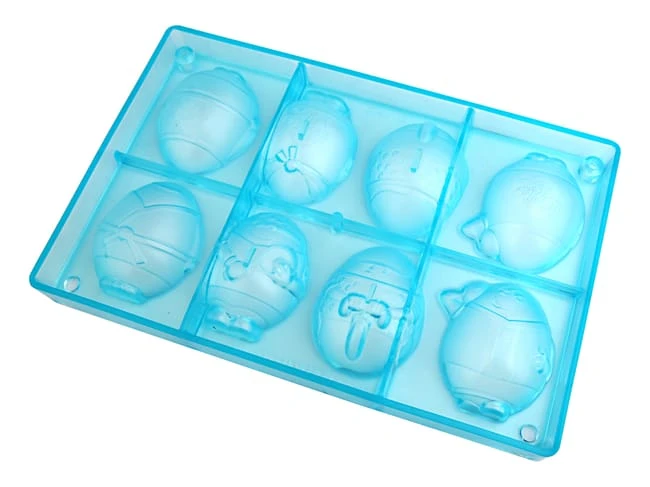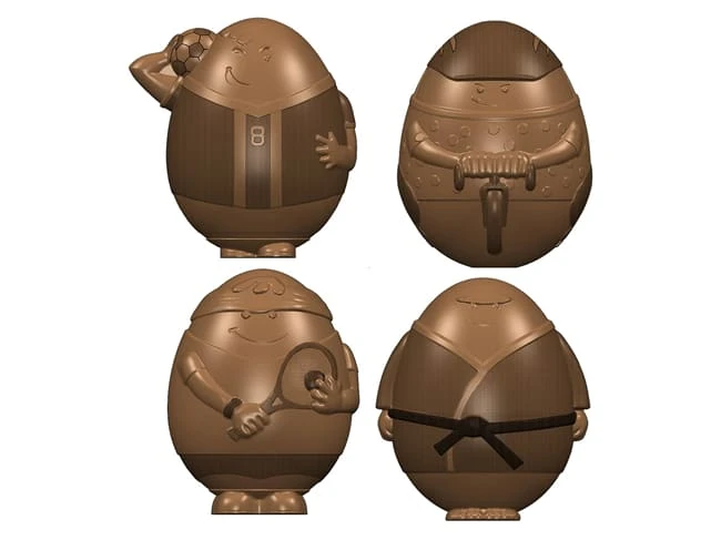 Moule en tritan comportant 8 empreintes pour réaliser 4 Oeufs « Maillots assortis » après assemblage représentant le handball, cyclisme, tennis et karaté.