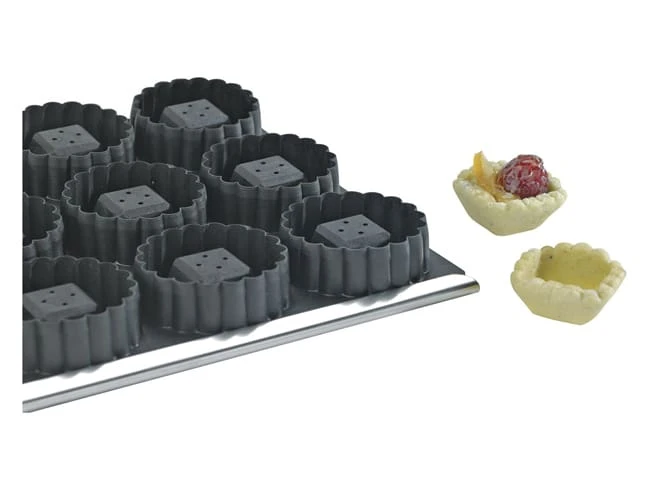 Nouvelle conception de moules sur plaque permettant de réaliser très rapidement des fonds de tartelettes sans fonçage. Moule en 3 parties composé d’une plaque support en aluminium, d’une plaque de découpe et d’une plaque de mise en forme en matériau composite -20 à +170°C.