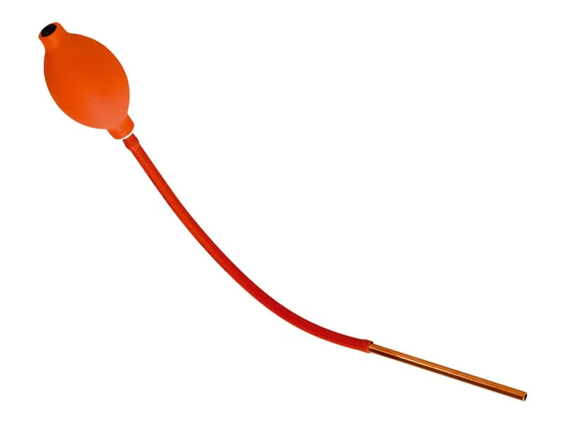 Pompe à souffler le sucre. Modèle à simple détente, poire avec clapet anti-retour, conduit en caoutchouc.