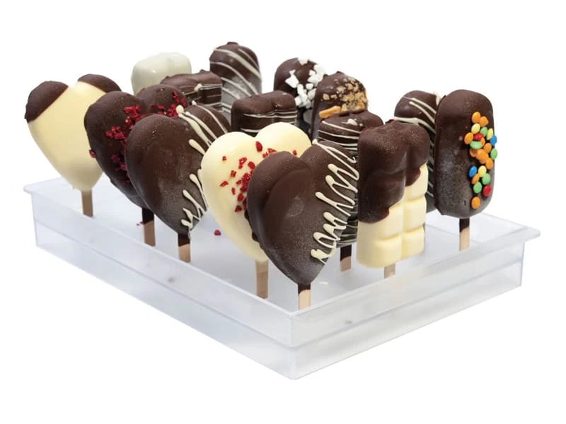 Support et présentoir avec encoches pour bâtonnets glacés en plastique alimentaire pratique, résistant et fonctionnel.